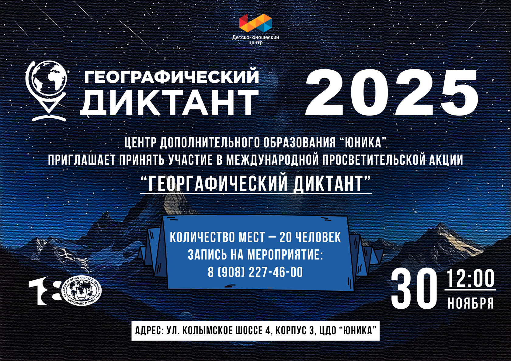 30 ноября в 12:00 на базе центра дополнительного образования «Юника» пройдет международная просветительская акция «Географический диктант 2025».